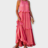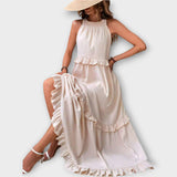 è l'incarnazione dell'eleganza rilassata dell'estate. Con una silhouette leggera, romantici volant e un tocco boho, questo abito avvolge il corpo esaltando la femminilità e offrendo comfort per tutto il giorno. Perfetto per spiagge, isole o gite estive.